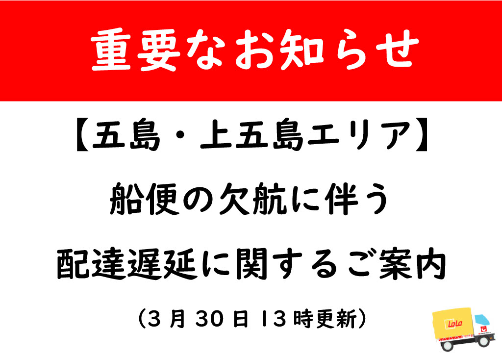 | 2026-03-30 | 配達 | 五島・上五島エリア 今週(3月30日~4月3日)の配達についてNEW |