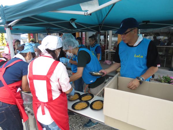 ララコープ役職員13名が参加し、皿うどん60食を炊き出し、食後のデザートとしてカステラ巻きをお配りしました。