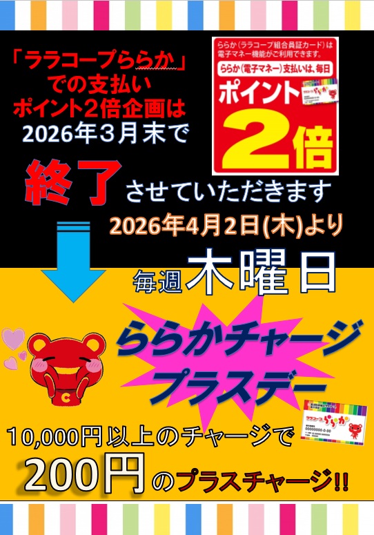| 2026-03-09 | ららか払いポイント2倍終了案内 |